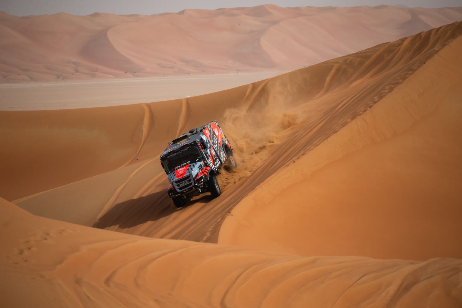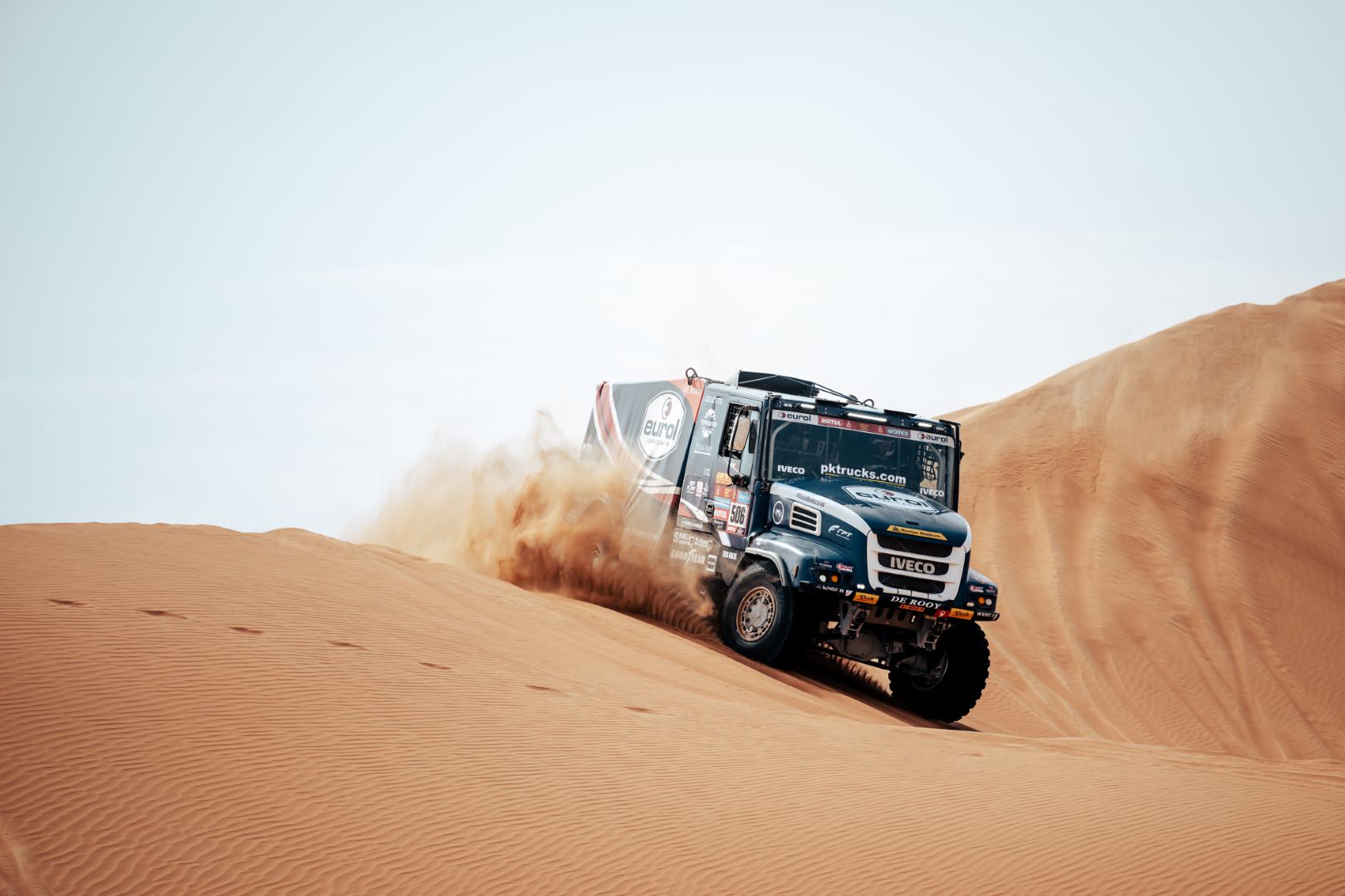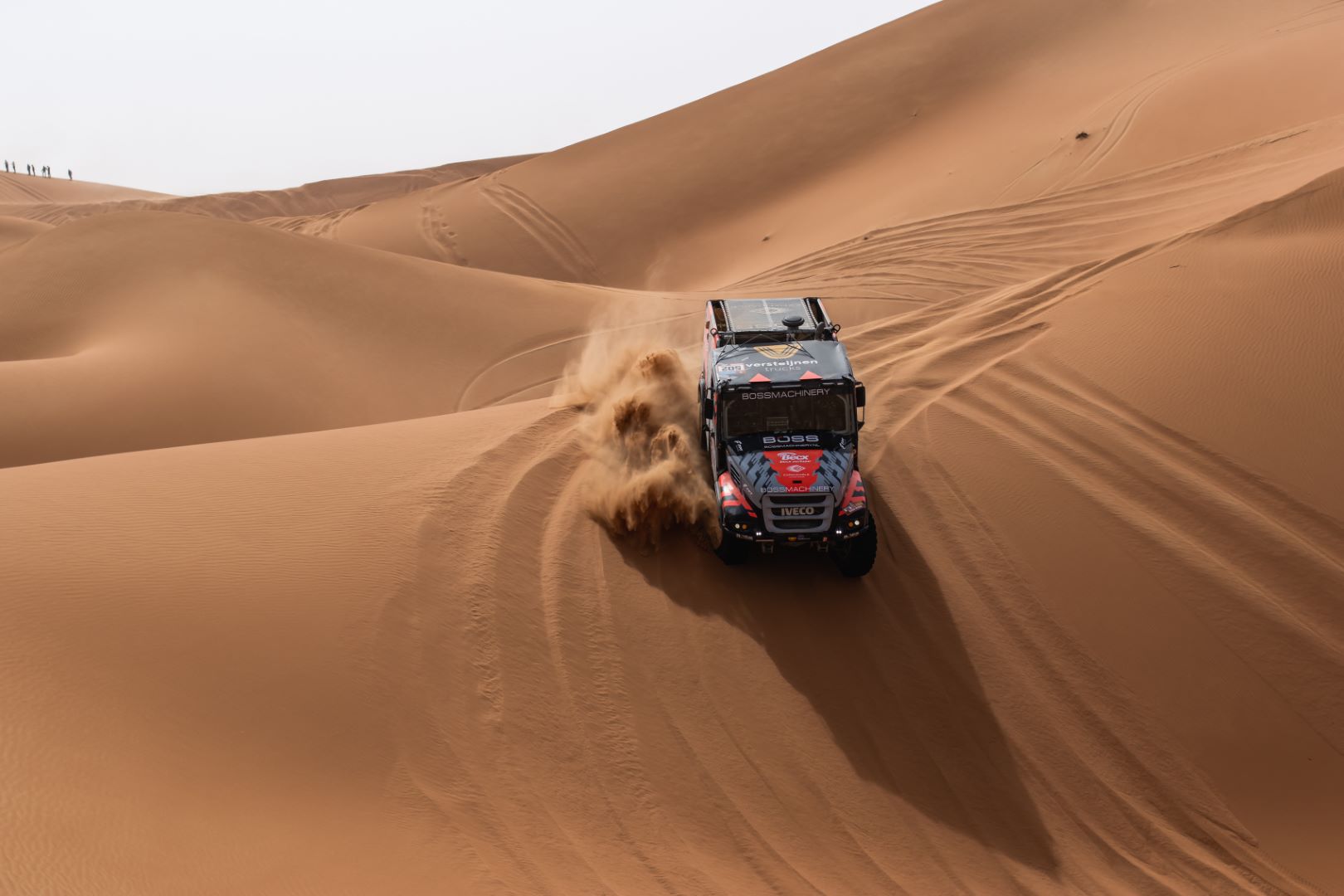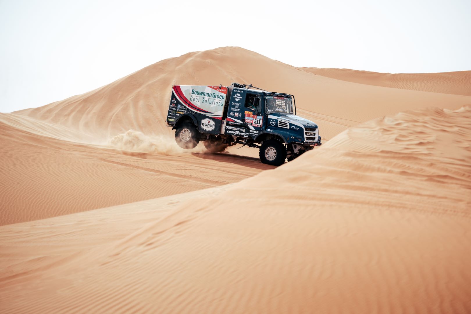 Janus van Kasteren jr., Marcel Snijders and Darek Rodewald started the twelfth stage with a minimal lead in the general classification of only 1 minute and 12 seconds. Boss Machinery Team De Rooy Iveco was the fourth truck to start the 185-kilometer special stage. In line with the past few days, this special stage also takes you through The Empty Quarter with its almost endless sand plains and dune areas.
