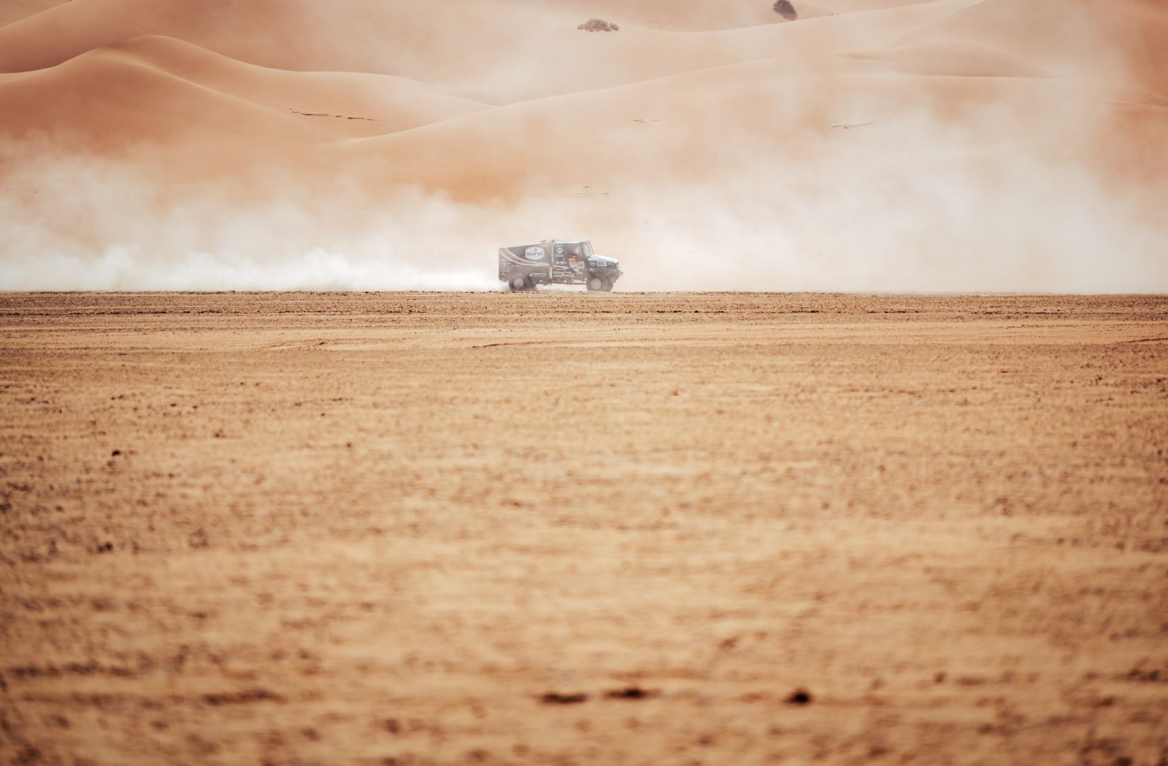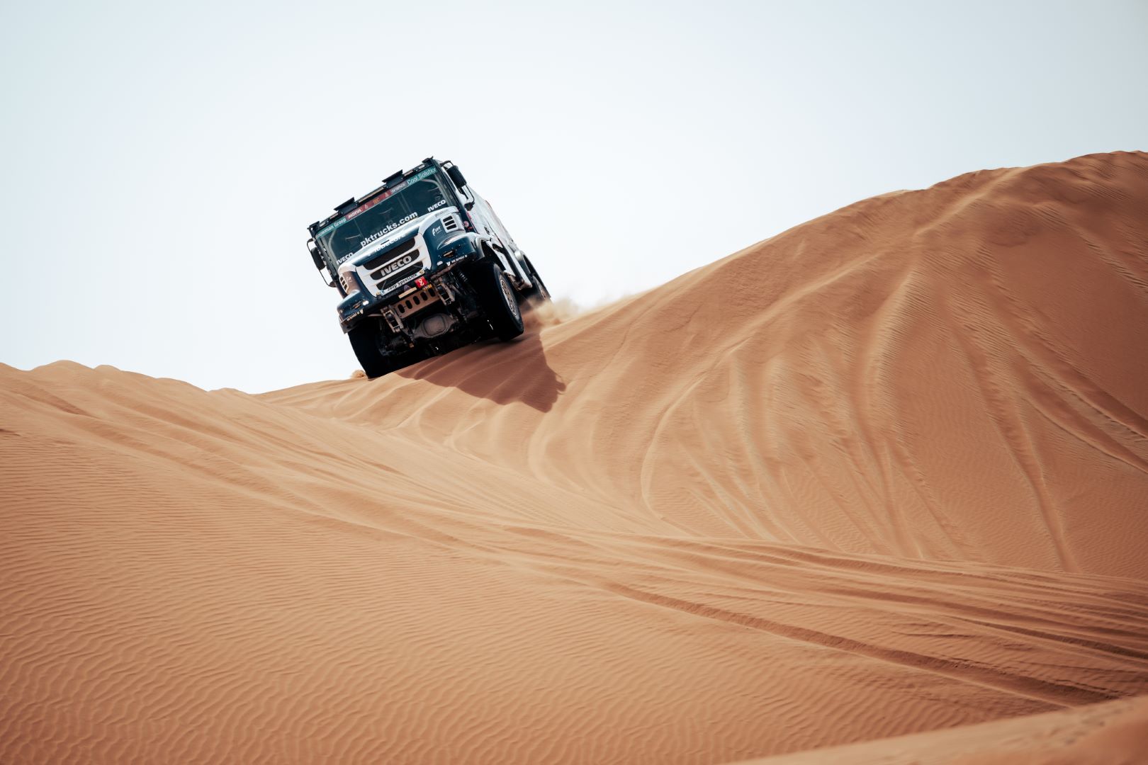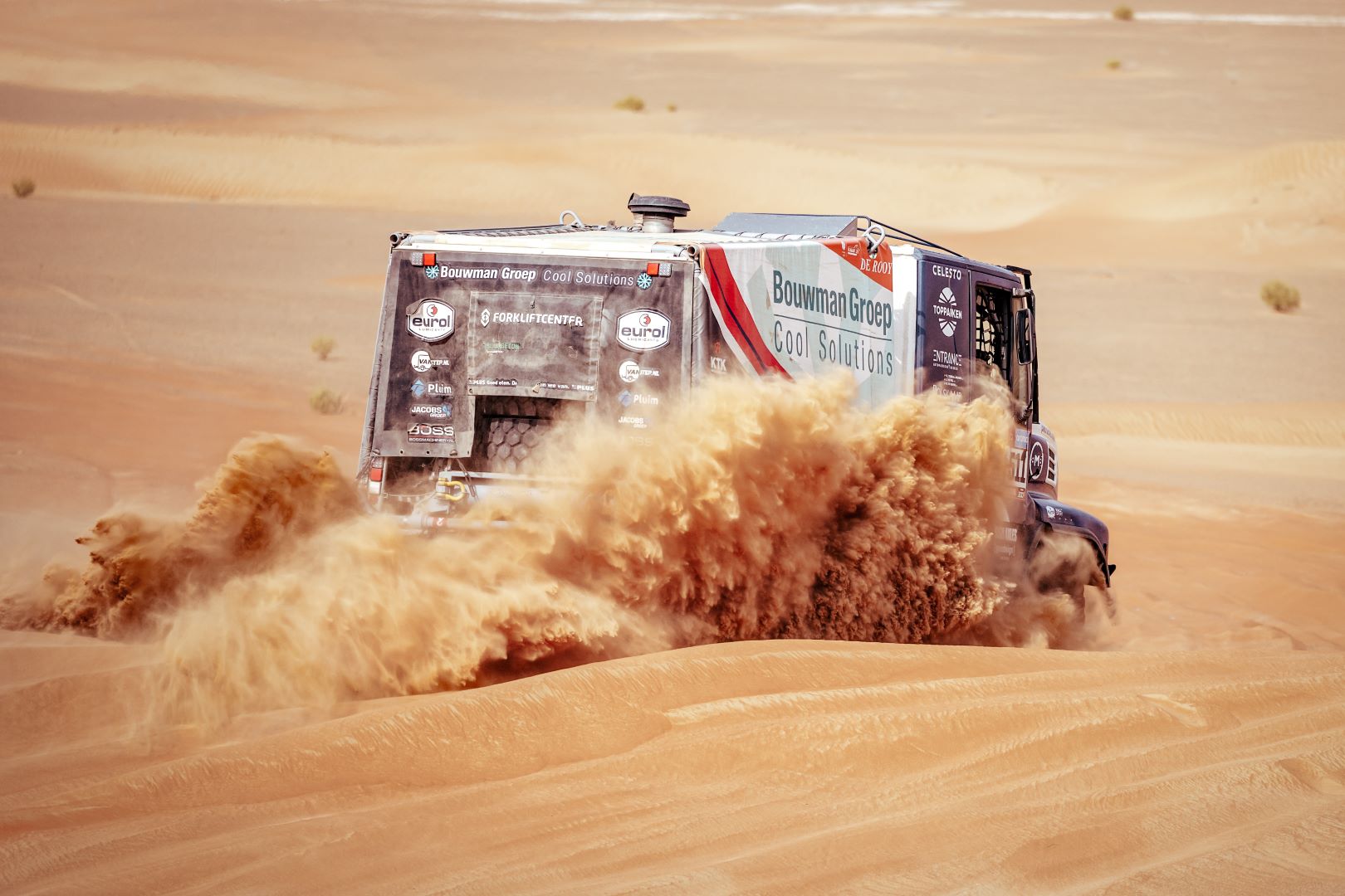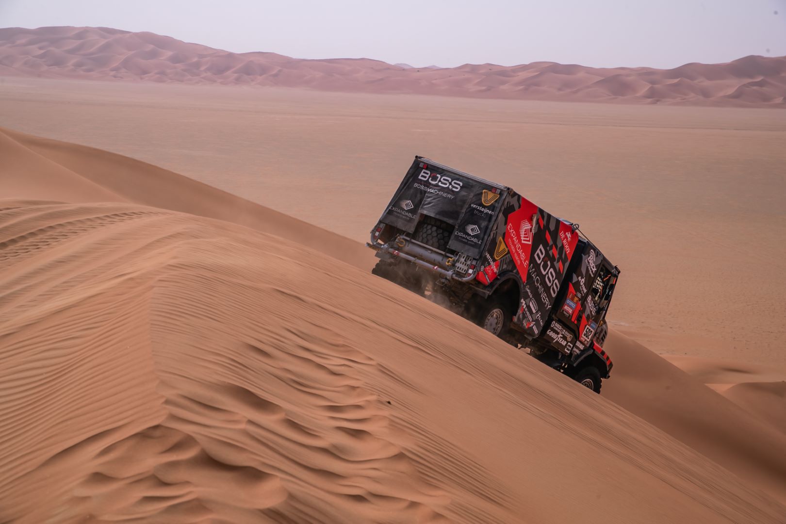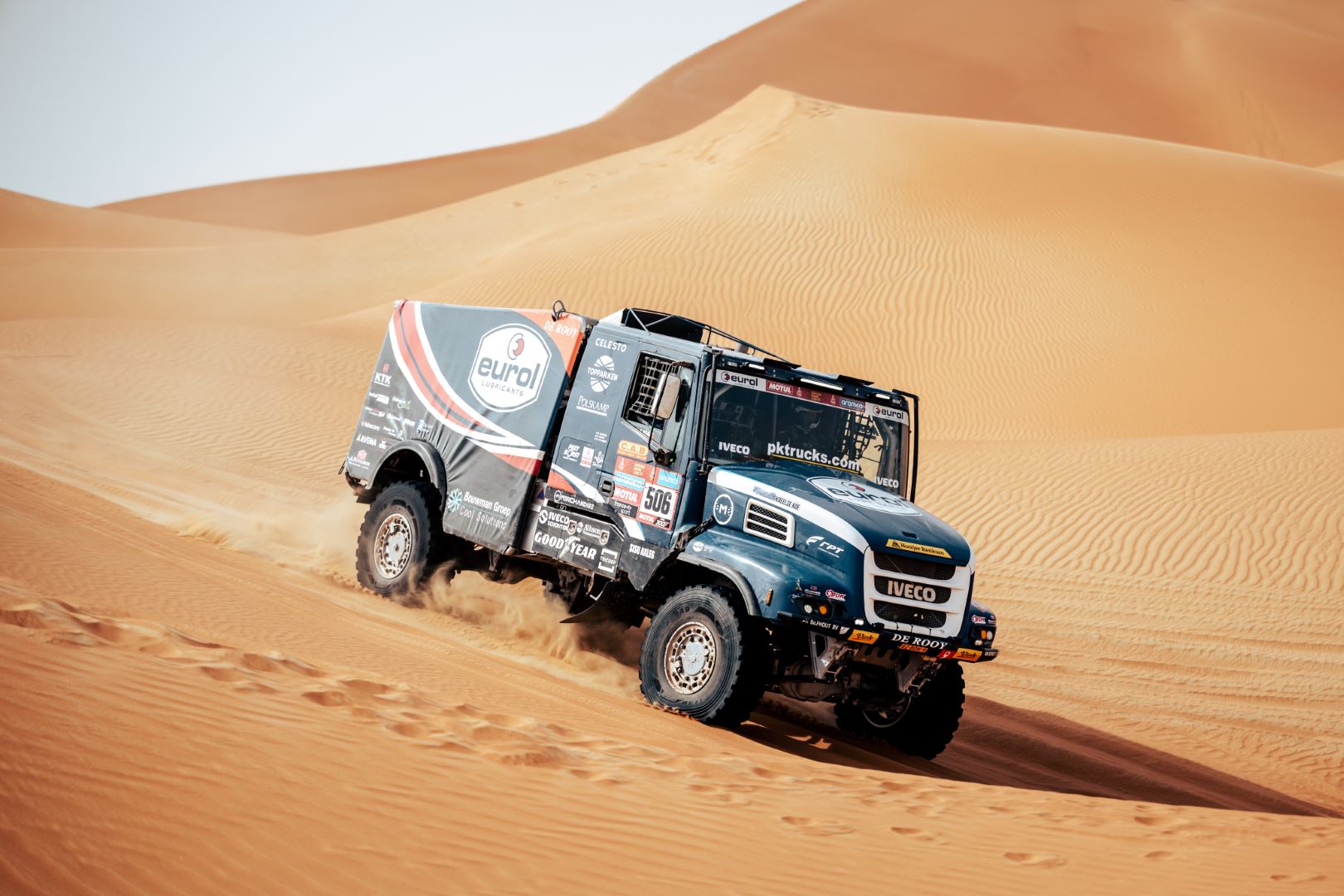Janus van Kasteren jr., Marcel Snijders and Darek Rodewald started the twelfth stage with a minimal lead in the general classification of only 1 minute and 12 seconds. Boss Machinery Team De Rooy Iveco was the fourth truck to start the 185-kilometer special stage. In line with the past few days, this special stage also takes you through The Empty Quarter with its almost endless sand plains and dune areas.