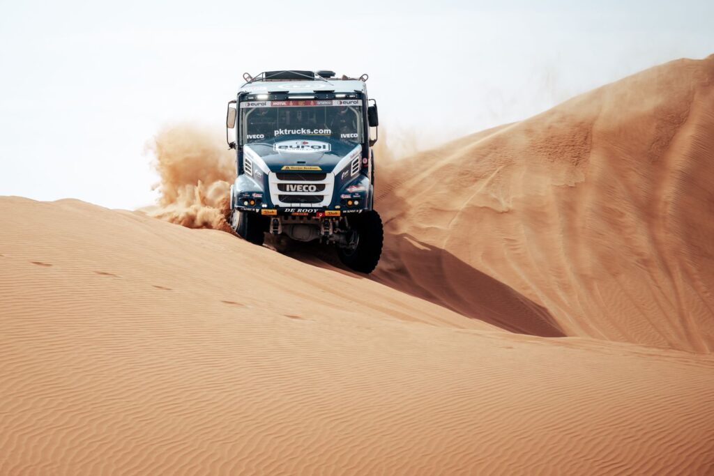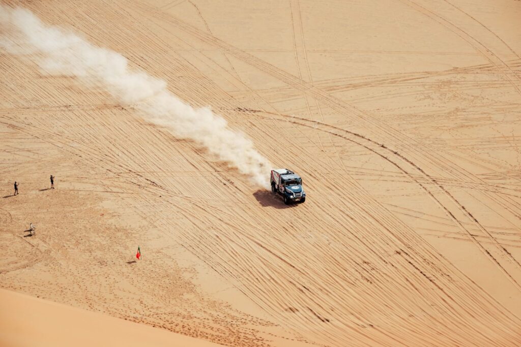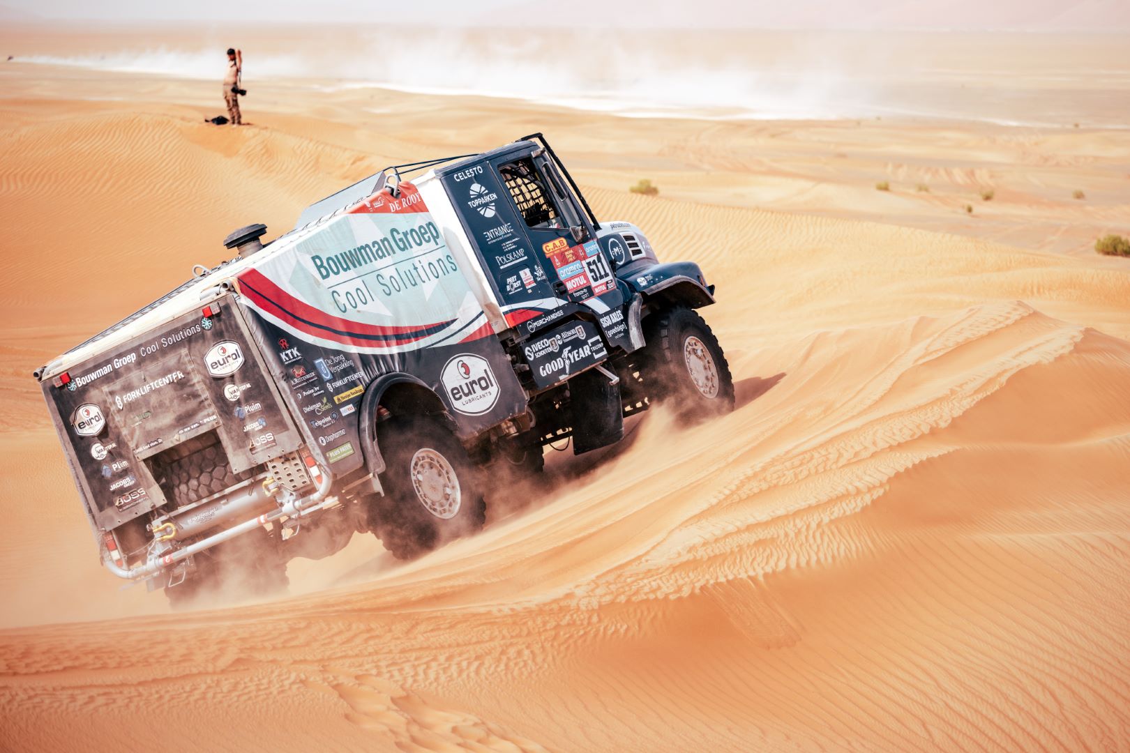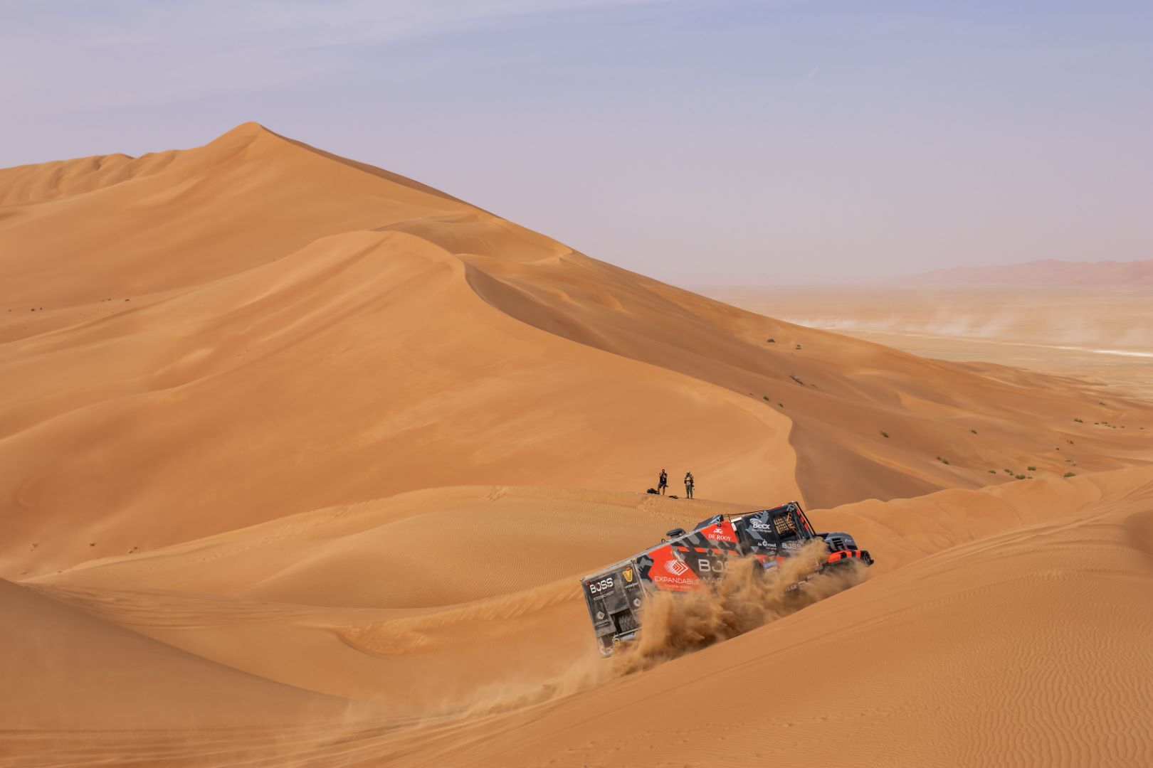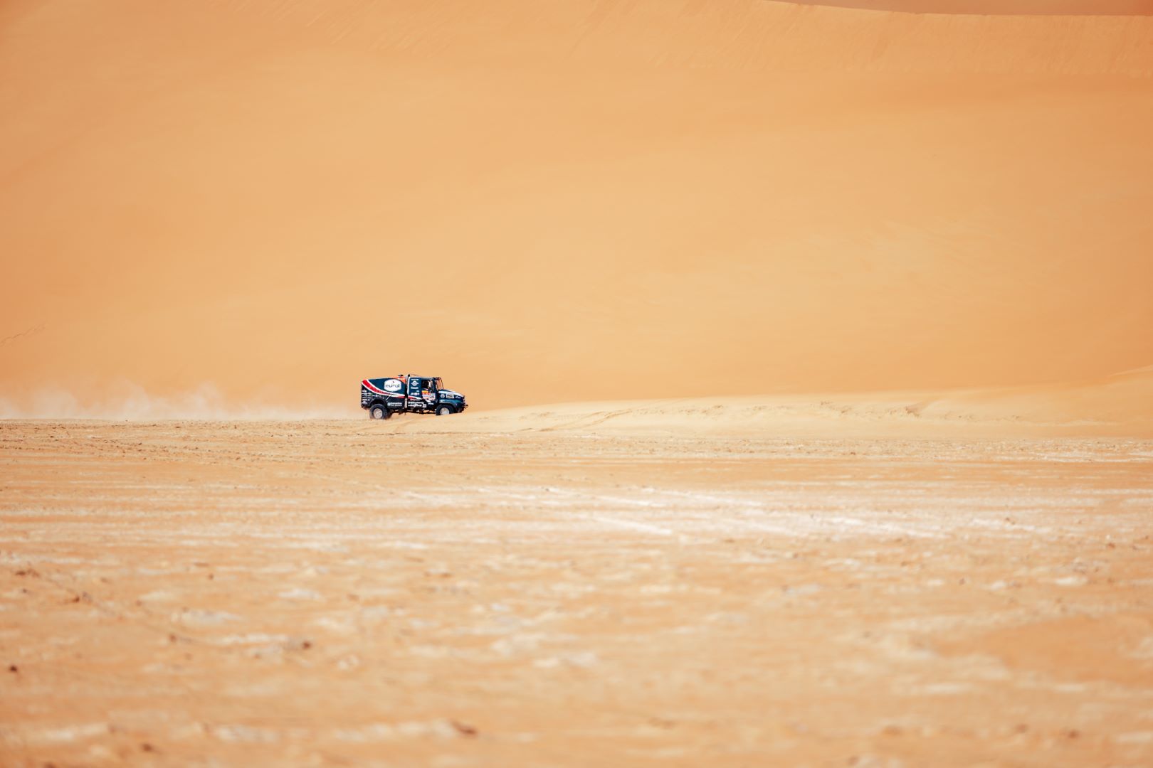 Janus van Kasteren jr., Marcel Snijders and Darek Rodewald started the twelfth stage with a minimal lead in the general classification of only 1 minute and 12 seconds. Boss Machinery Team De Rooy Iveco was the fourth truck to start the 185-kilometer special stage. In line with the past few days, this special stage also takes you through The Empty Quarter with its almost endless sand plains and dune areas.