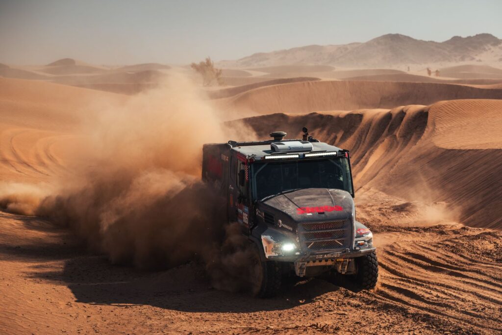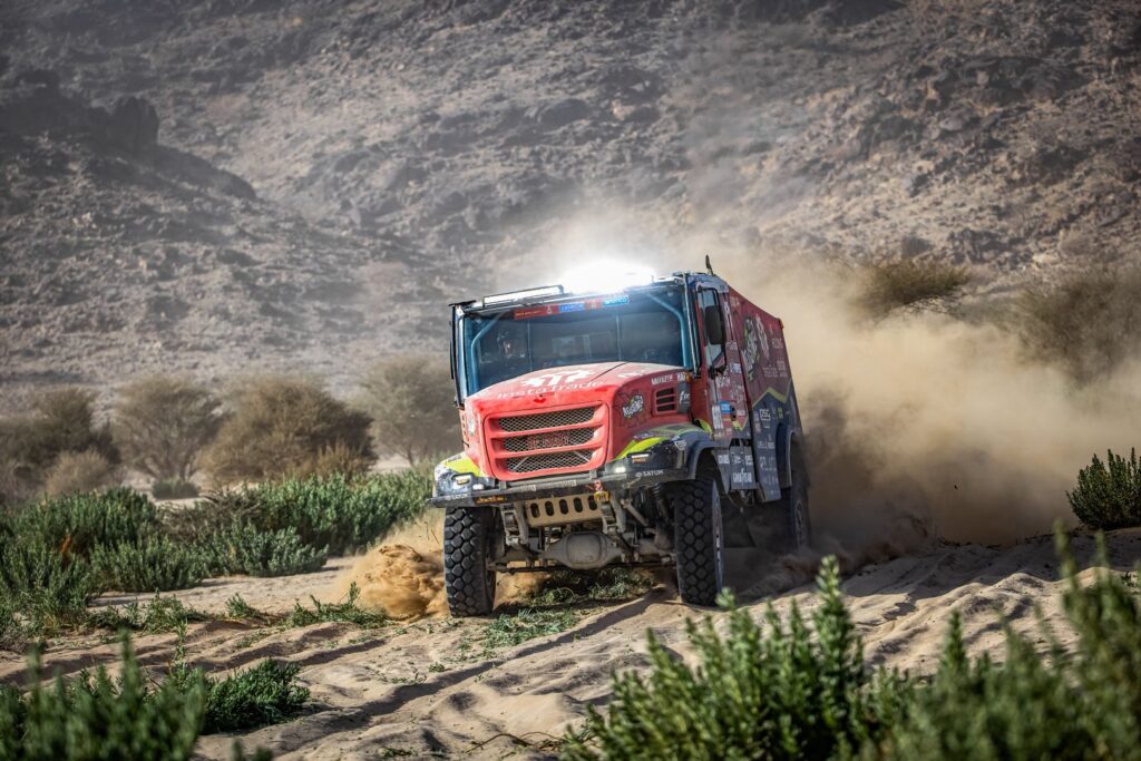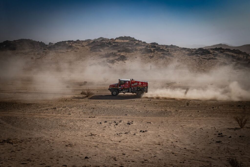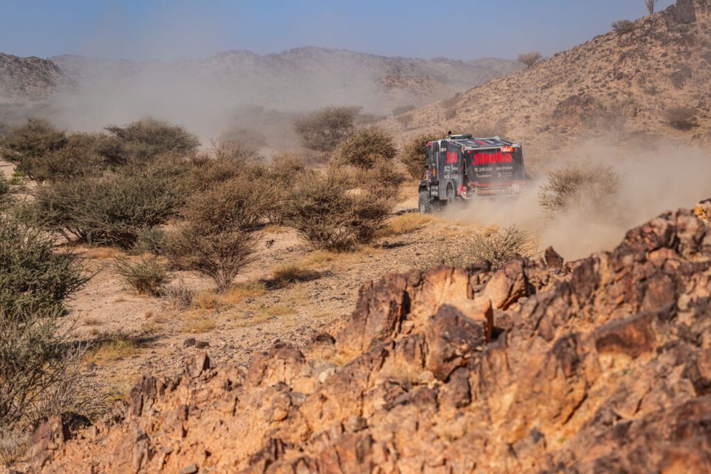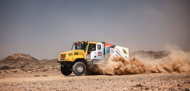 BISHA – The first day of the 48-hour stage started very well for Team de Rooy FPT. Aleš Loprais drove top times throughout the day and arrived at the bivouac in second place. Vaidotas Žala also joined the fight at the front and arrived at the bivouac in third place. Anja van Loon, together with her brothers Jan and Ben van de Laar, suffered some damage on the way but still managed to stay in the top five for a long time.