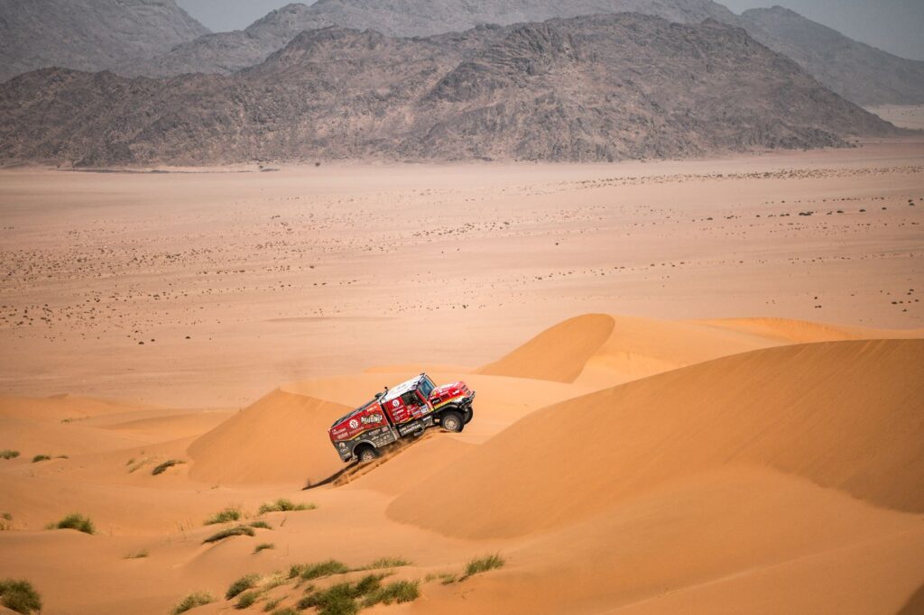 BISHA – The excellent first day of the Dakar Rally’s 48-hour stage on Sunday was followed by an equally excellent day on Monday for Team de Rooy FPT. Aleš Loprais and Vaidotas Žala finished the stage in second and third place among the trucks, respectively, in the same position they had arrived at the makeshift bivouac in the desert the day before. Anja van Loon even improved her performance. She was 11th on Sunday but crossed the finish line in Bisha one day later in eighth place.
